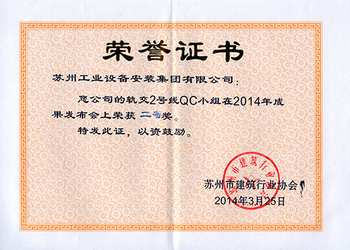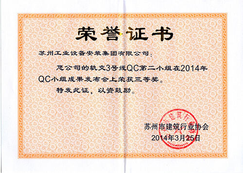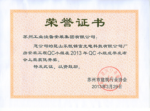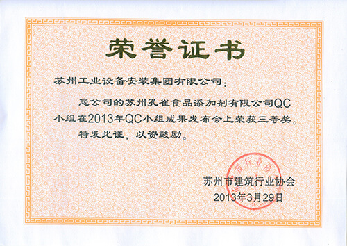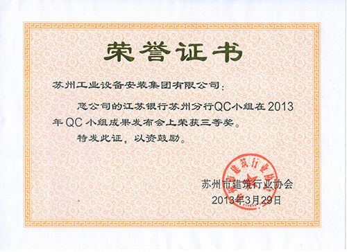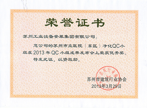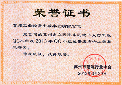 苏州市立医院东区地下人防工程QC小组在2013年QC小组效果宣布会上荣获三等奖