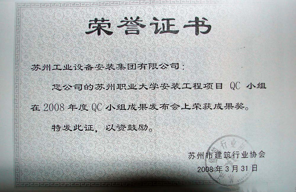 苏州职业大学装置工程项目QC小组在2008年度QC小组效果宣布会上荣获效果奖