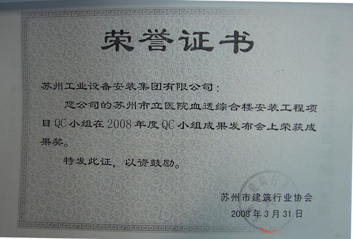 苏州市立医院血透综合楼装置工程项目QC小组在2008年度QC小组效果宣布会上荣获效果奖