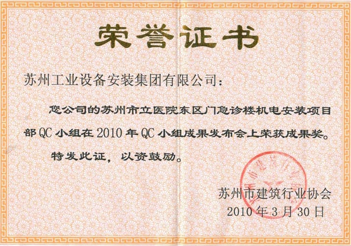 苏州市立医院东区门急诊楼机电装置项目部QC小组在2010年QC小组效果宣布会上荣获效果奖