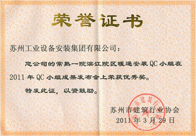常熟一院滨江院区暖通装置QC小组在2011年QC小组效果宣布会上荣获优异奖