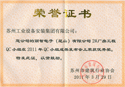 丽智电子(昆山)有限公司2#厂房工程QC小组在2011年QC小组效果宣布会上荣获优异奖