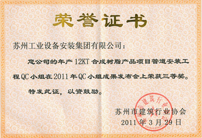 年产12KT合成树脂产品项目管道装置工程QC小组在2011年QC小组乐成宣布会上荣获三等奖
