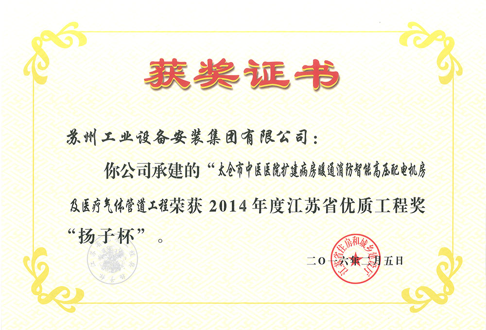 太仓中医院暖通消防配电及医疗气体管道工程扬子杯